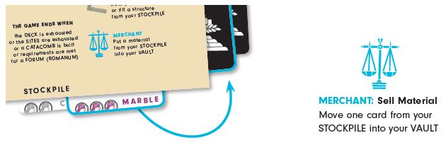 You perform a Merchant action by taking one Material card from your Stockpile and tucking it face-down underneath the right edge of your Camp - into your Vault. The Values of cards in your Vault count as Victory Points at the end of the game.