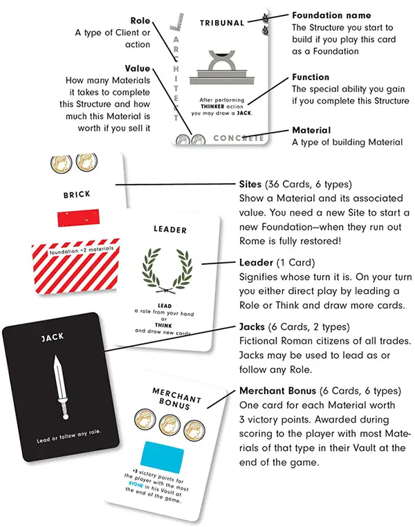 The object of the game is to gain wealth and power (Victory Points) by both completing Structures for Emperor Nero and selling the building materials for your personal gain!