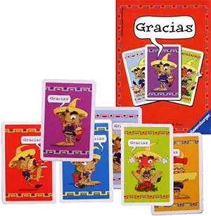 Next, he decided which of the two face-up cards (of the triplet) to keep, adding it to his play area face up. Finally, he gives the other face-up card (of the triplet) to any one of his opponents, placing it face up in the opponent's play area. The opponent, naturally, responds with a heartfelt",Gracias!