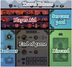 It's also a player aid, showing the course of each round, the result of exchanging Travel Tokens, the claimed Harbor rewards and the end of game scoring.