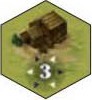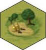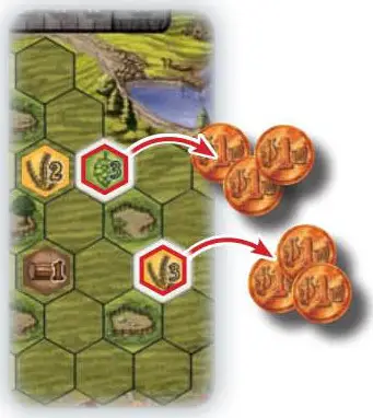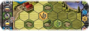 /Example Peter moves his player figure to a resource space that contains one yellow resource tile with a fertility number of 3 and one green resource tile with a fertility number of 5.