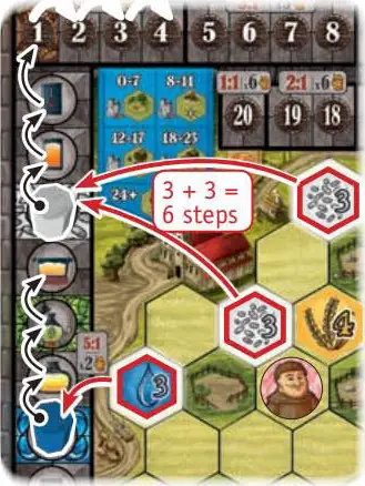 Move your brewmaster as many steps forward on your production track as is indicated in the reward table (0 to 6 steps).