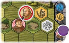 Peter places a scoring disc on the tile scoring spot of this monk. Thus each of his monks of this type is triggered and activates each tile directly adjacent to it (highlighted by a red border). The blue re source tile is activated twice.