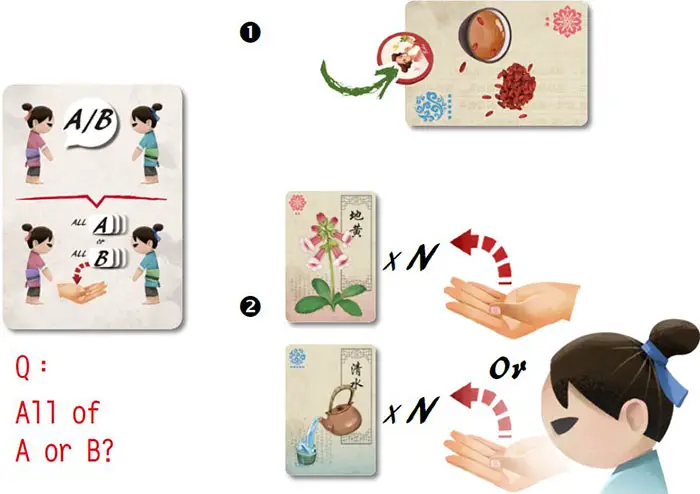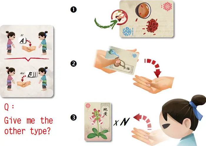 Example: 1 Amy has a medicine marker on the Red-Blue medicine card and chooses Bob, 2 Bob has to give Amy all the red ingredient cards or all the blue ingredient cards.