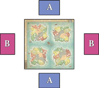 Players should decide their alliances before starting the game. These alliances will be permanent and cannot be broken. Members of the same alliance should not sit next to each other, and their seats should be alternated. So, the seating order should look like this: