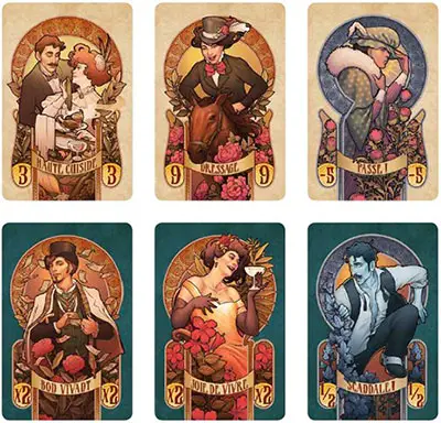 Four cards in the status deck have a dark green background - the three prestige cards, and the Scandale card. As soon as the fourth one is revealed, the game ends immediately, with no bidding for the revealed card.
