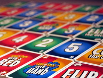 For example: You may play a RED card of any kind on top of another RED card, or a NUMBER 5 card of any color on top of another NUMBER 5 card. After playing one card from your hand, your turn ends.
