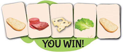 To win, you must begin a turn with a perfect sandwich, made up of five unspoiled ingredient cards, face up on the table, side by side, in this order from left to right: bread, meat, cheese, lettuce, and bread.