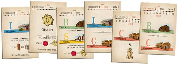 Sort the buildings and place all of the 'Settlement' and 'Settlement/Town' buildings near the board in the Building Supply. Sort the buildings by type (Residential/Industrial/Commercial).
