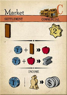 To build a building, the player chooses a building from the Building Supply whose type matches their auction tile and pays the cost of that building in resources. The player may buy the necessary resources at the Marketplace.