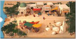 The blue market cards can be played exactly once as an action in a later turn of the player who draws it. The purple statue cards and the green decoration cards will earn you points at the end of the game.
