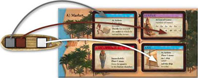 Example: This four-stone ship was sailed to the market. The white player can first take a card and she selects the sail card. Then the brown player chooses the statue card. Then the gray player chooses the lever card. By the end, all of the stones that were on the ship are returned to the quarry.