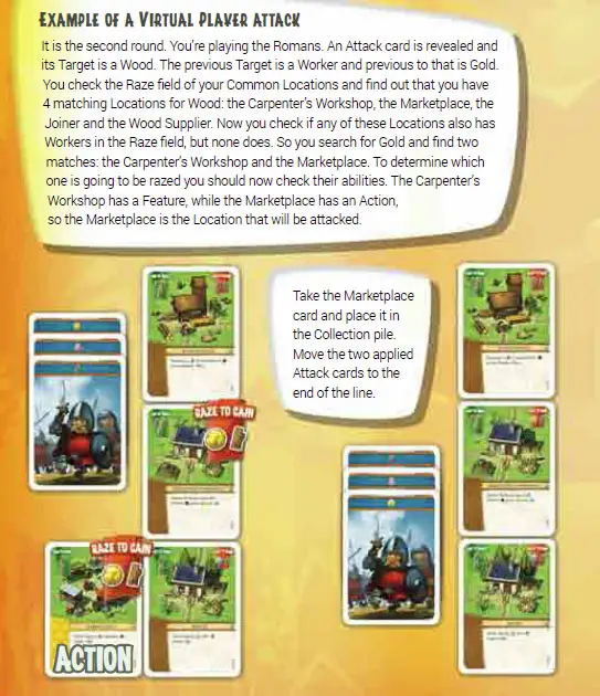 Note: Once the target of the virtual player attack is determined, raze your Location. The virtual player does not receive any Goods nor is the Location turned into a Foundation. Instead, the razed Location is placed on the virtual player's Collection pile.