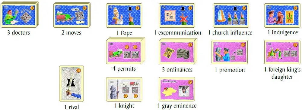 The elector spaces in the Archdioces of Mainz, Koln, and Trier may only be filled with Barons, not with Couples. The player, who places the new elector, takes 2 victory points immediately!