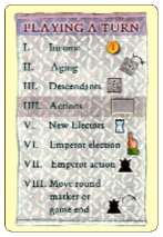 With the help of the start position card, players place arictocrats on the board. Always place the indicated life stage at the top. This shows the currect age of the aristocrat. The Emperor starts and the others follow in clockwise order.