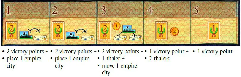 Example: the round marker is in round 2. The Emperor takes 2 victory points and places 1 empire city.