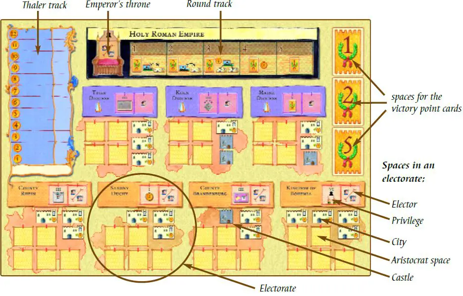 The game board shows the Thaler track, the Emperor's throne with the Round track, 3 spaces for the victory point cards, and 7 Electorates (upper row: 3 spritual electorates = Archdiocese, lower row: 4 secular electorates).