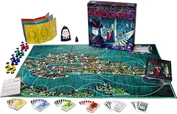 The game board represents a map of Venice, with its islands and its channels. Highlighted on the map are important game elements: