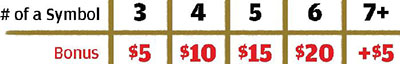 Players are awarded bonuses for collecting sets of like symbols from their completed contracts. Players will collect $5 for a set of 3 plus an additional $5 for each symbol thereafter. So a set of 5 is worth $15 and a set of 8 is worth $30, etc.