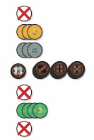 NB: the value of a bonus is not known until it is drawn. For 3 cards sold, it will be 1, 2 or 3 rupees. For 4 cards sold, it will be 4, 5 or 6 rupees and for 5 cards sold, it will be 8, 9 or 10 rupees. Unlike the goods tokens, the rupee value of the bonus token is only printed on the back (hence the question marks on the front).