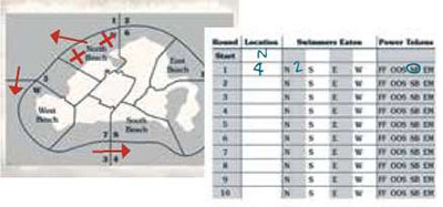 On the Round 1 line of the Shark Tracker Pad, the Shark player writes "4" in the Location column (their new location) and writes "2" next to the "N" in the Swimmers Eaten column (they ate two Swimmers at the North Beach).
