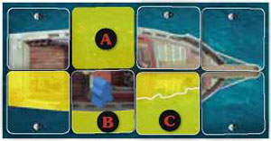 Adjacency Example #2: One Boat Space has been damaged (C) and another has been destroyed (A). Hooper is now adjacent to two Boat Spaces and three Water Spaces because his space shares a border with all of them.