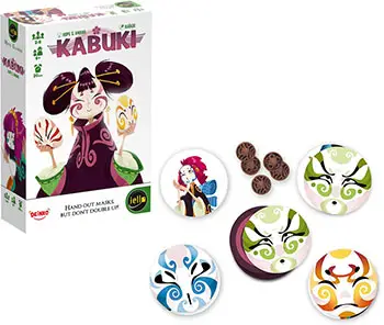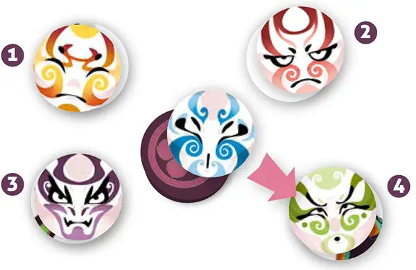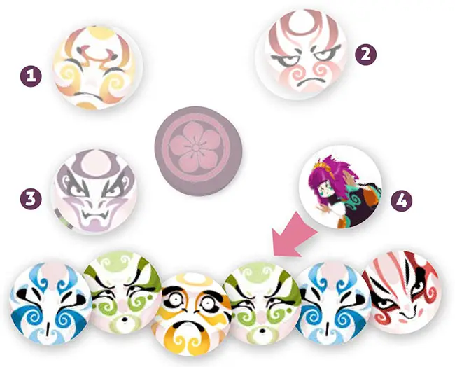 You are giving masks to different actors in a Japanese theater. Avoid giving the same Mask to an Actor twice! If someone realizes your mistake, she takes one of your Victory Point tokens. On the other hand, if you realize another player's mistake, you take one of his.