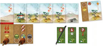 The first player (whoever has the Grand Master pawn) draws as many Lesson cards as there are players, and places them on the first row of the School board. These cards are placed face-up or face-down according to the instructions on the spaces on which they're played.