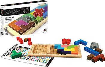 There are 12 polygon pieces included in Katamino. Each of these pieces covers 5 spaces on the board and is called a Pentamino.