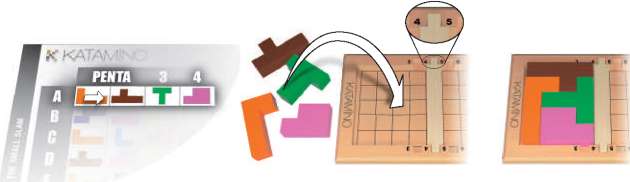 The Small Slams consist of 42 PENTAS. To begin your first small slam, Place the slider on the board between numbers 3 and 4, and then take the first 3 Pentaminos shown on the table on line A until column 3 and complete the PENTA 3.