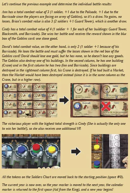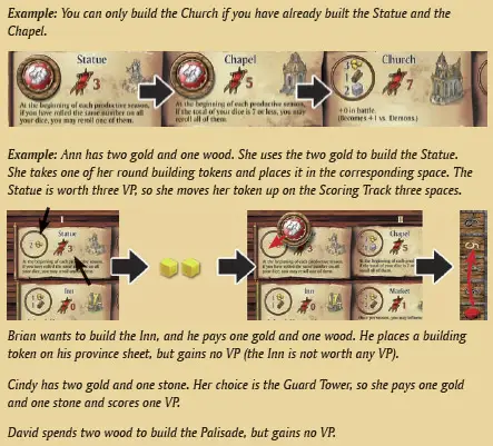 Example: The Jester awards one Victory Point to Ann: Ann moves her token ahead on the Scoring Track one space. There are no dice on the Squire, so he is ignored. The Architect donates one wood to David, who takes it from the supply. The Merchant lets Cindy choose whether she wants one gold or one wood. She already has a gold, so she goes for the wood. After ignoring the Sergeant (no dice on him), it's time to resolve the Alchemist. Cindy gives the wood she just acquired (from the Merchant) back to the supply and takes one gold and one stone.