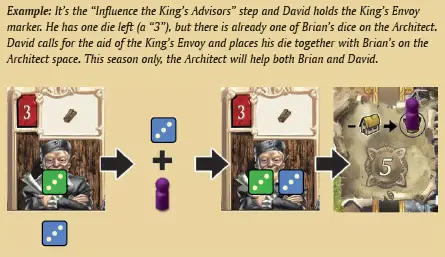 You cannot influence an advisor if that advisor has already been influenced during the current season (by another player or by yourself). In other words, each space in the King's Court can have only one die (or dice group owned by a single player) on it. The only exception to this rule occurs when a player uses the King's Envoy.