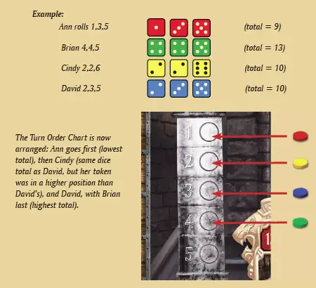 Then, the positions of all the player tokens on the Turn Order Chart are adjusted for the season: each player adds up the value of all his or her dice (including any white dice rolled for this season). The player with the lowest total will be the new first player, with the other players acting in order of dice totals (so the player who rolled the highest total for this season will occupy the last position of the Turn Order Chart).