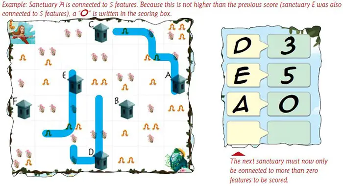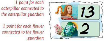 Players draw paths on their play mats, trying to connect features (caterpillars and flowers ) to sanctuaries and guardians. At the end of ' each round, a sanctuary is scored as long as it is connected to more features than the previous sanctuary.