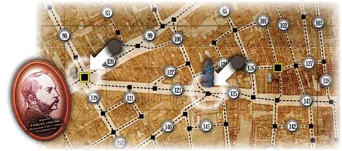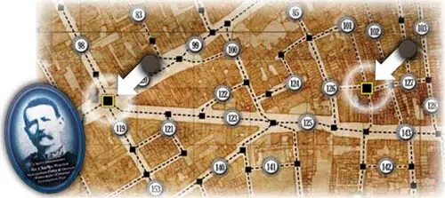 2. During play, Jack the Ripper, the Policemen, and the wretched are moved along the dotted lines that represent Whitechapel streets.