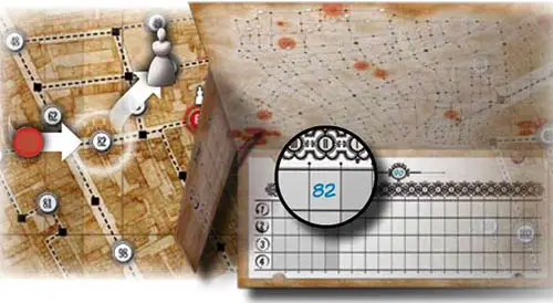 Jack's victim is on numbered circle 82. Jack notes "82" on his sheet in the space corresponding to the Roman numeral "II", as marked by the Time of the Crime token. He does this on the first line of his sheet because this is the first night of the game.