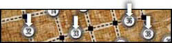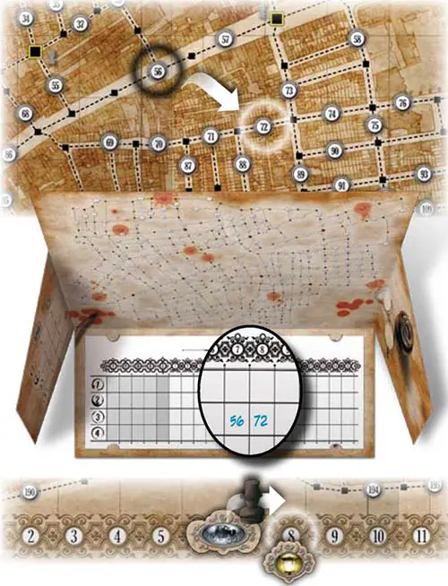 Jack is on numbered circle 56 and decides to use an Alley. His legal destinations on the block of houses to his south are 57, 73, 72, 71, 70, and 69. He chooses numbered circle 72 as his destination, and he records that number in the next square of his sheet. He places the Alley token on the move track as a reminder for the detectives, then he moves his Jack pawn one space forward, as usual. The labyrinthine back alleys of Whitechapel can greatly complicate matters for the police detectives...