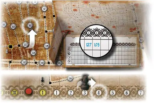 Jack makes his move from numbered circle 127 (his previous location) to numbered circle 103. He writes the new number on his sheet in the next available space. Then he moves the Jack pawn one space rightward on the track on the game board. Jack skulks down Whitechapel streets, hidden in the shadows...