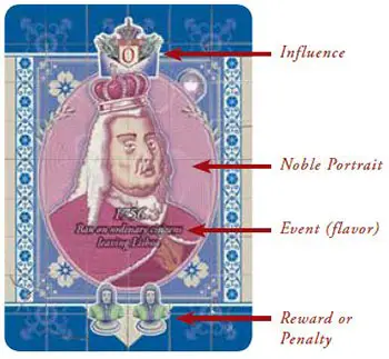 Noble cards represent a political event in which you engage with one of the Nobles. You can play this type of card in the Royal Court to visit the Noble, or into your Portfolio for the reward and for future Influence.