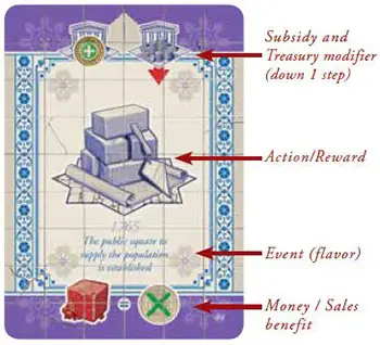 Treasury cards represent a subsidy from the Royal Treasury to you. You can play this type of card in the Royal Court for the action/reward, or you can play it into your Portfolio to take a subsidy from the Royal Treasury and gain a permanent money/ sales benefit.