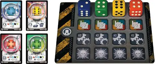 To do that, they arrange the four dice on the four dice icons, on the first row of the Leader board in the desired order of play. For example, if the blue die is placed in column 1, then the blue player will go first.
