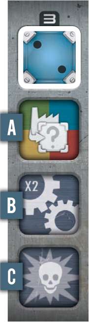 Each time a die reaches a new icon, the Leader must announce aloud what is happening next. For example, when the Blue die displaying a 2 Value is moved down to the Production icon, the Leader should say: "Production for everybody with a building value of 2".