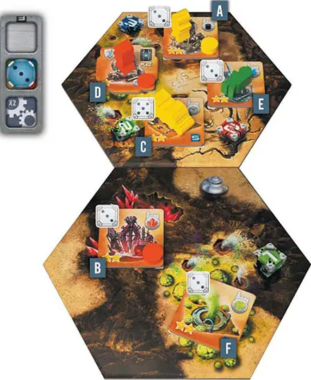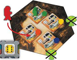 When a die reaches the Cataclysm icon, the Leader announces the color of the die and its value. Then, the players locate on the hexagons the die icons of the given color and value. If there is no such die on the hexagons, then nothing happens and the game proceeds to the next step.