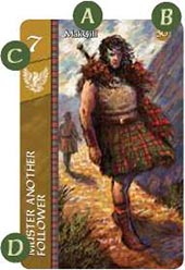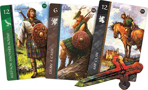 A Clan - Each card belongs to one of the eight normal Clans or to the royal Clan Bruce. The name of a Clan, the portrait of its chief, its Clan tartan, and badge are displayed on each card.