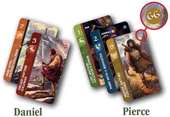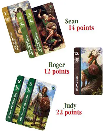 Example: Judy has won the skirmish with 22 points (11 doubled to 22 for having her whole army composed of two or more cards from the same Clan). Roger has only one card and cannot qualify for the doubling.