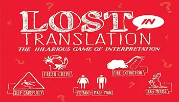 The party game Lost in Translation consists of a deck of clue cards and a pad of blank answer sheets. There are 3 kinds of cards in the deck: