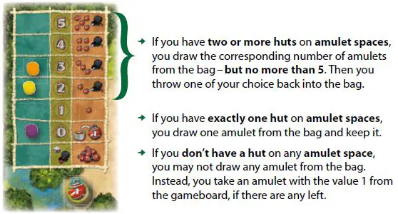 With your amulet pillar on the amulet track, you mark the number of huts you have on the red-encircled amulet spaces. The more huts you have built on amulet spaces, the more amulets you are allowed to collect. Lay down the amulets you have collected face-down in front of you.