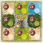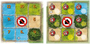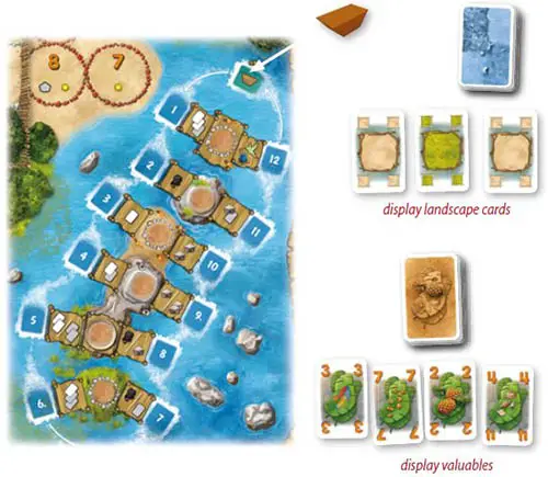 In the two- and three-player game, there are only seven stone area tiles placed, since no tile is positioned on the space with the hut of a "neutral" color.
