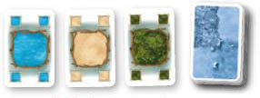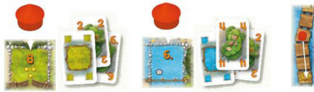 Shuffle the landscape cards. Each player gets 2 of them and takes them into his hand. Put the remaining landscape cards as a face-down draw pile next to the gameboard. Reveal three landscape cards and lay them out next to one another.