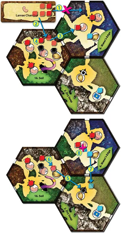 Reaction: Each other player may place one larva from their Larvae Chamber onto any hex they inhabit or into The Great Tunnel.